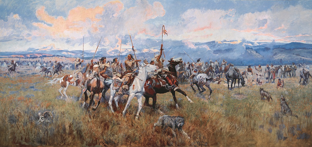 Lewis and Clark Meeting Indians at Ross’ Hole depicts a fortuitous encounter between Thomas Jefferson’s Corps of Discovery and the Salish Indians in the Sula Basin in the southwestern corner of Montana. The meeting, which occurred in September 1805, was one of enormous strategic importance as it enabled the expedition to secure the horses and directions needed to traverse the Bitterroot Mountains before winter snows would make travel impossible. As art historian Patricia M. Burnham observed, the mural “is grander than could have ever been anticipated. . . . With a sweep of horses, Salish warriors, and tilted lances in the center foreground, Russell brought the action into the visual space of the assembly. By relegating Lewis and Clark to the quiet of the middle ground at right, Russell gives over the most important part of the picture space to Montana’s original inhabitants. Nowhere else in the Capitol is the Indian presence in Montana so celebrated.” Measuring approximately twelve feet high by twenty-five feet wide, the painting is the largest that Russell ever produced; its completion required that Russell raise the roof on his log cabin studio in order to accommodate it.
