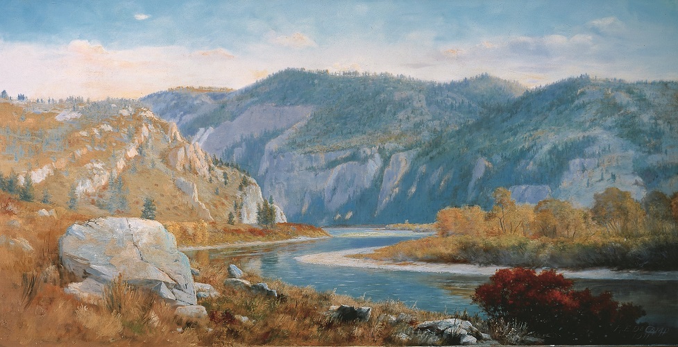 The Gallatin refers to the area of southern Montana immediately north of Yellowstone National Park through which the Gallatin River (pictured) flows. Once again, DeCamp chose a spot from which one sees water, mountains, and big sky at the same time. The river in this case is centered, flowing gently toward the viewer. The artist seems to enjoy playing the curve of the tree-lined river against the encircling contour of mountain behind it.
